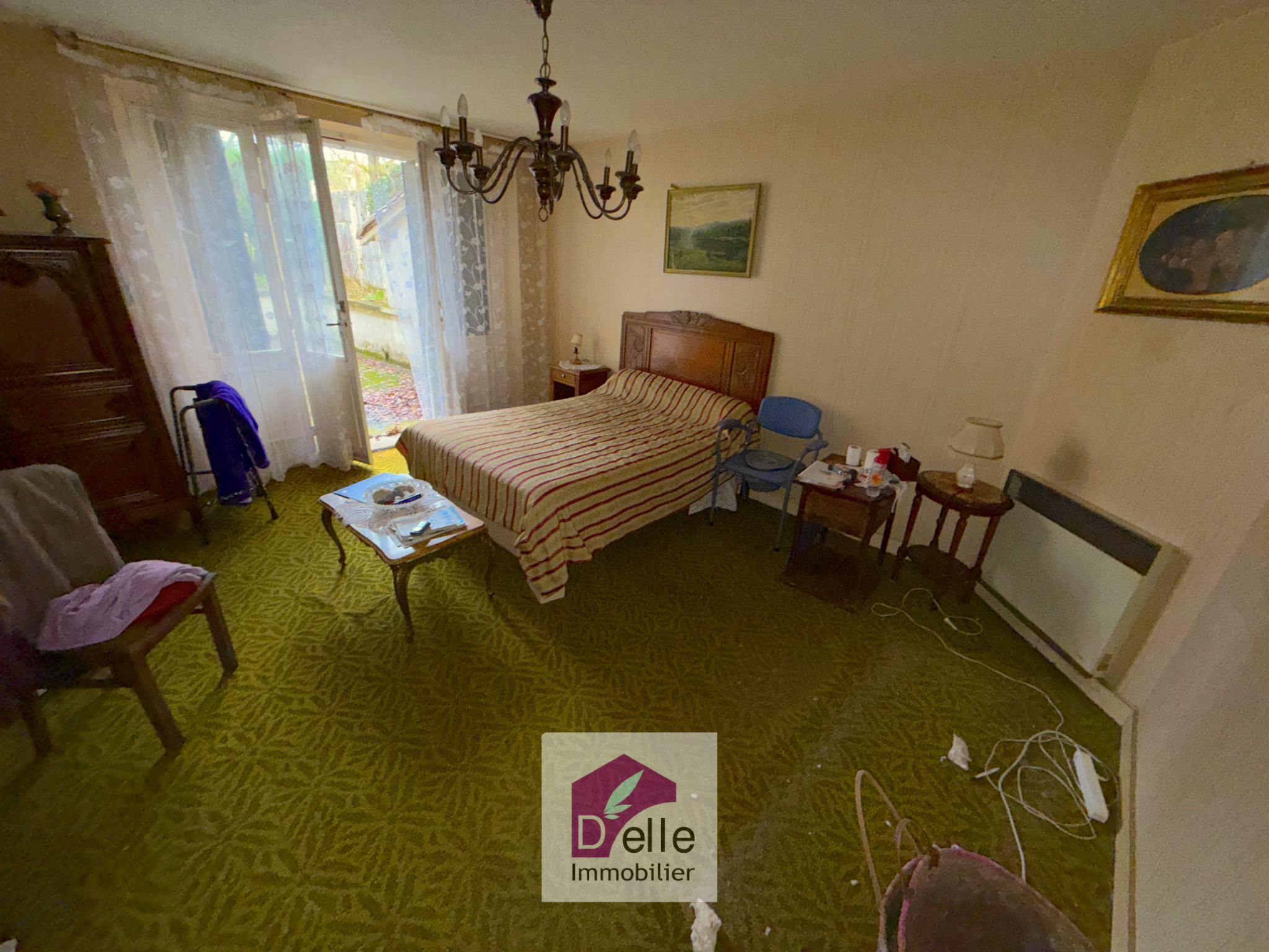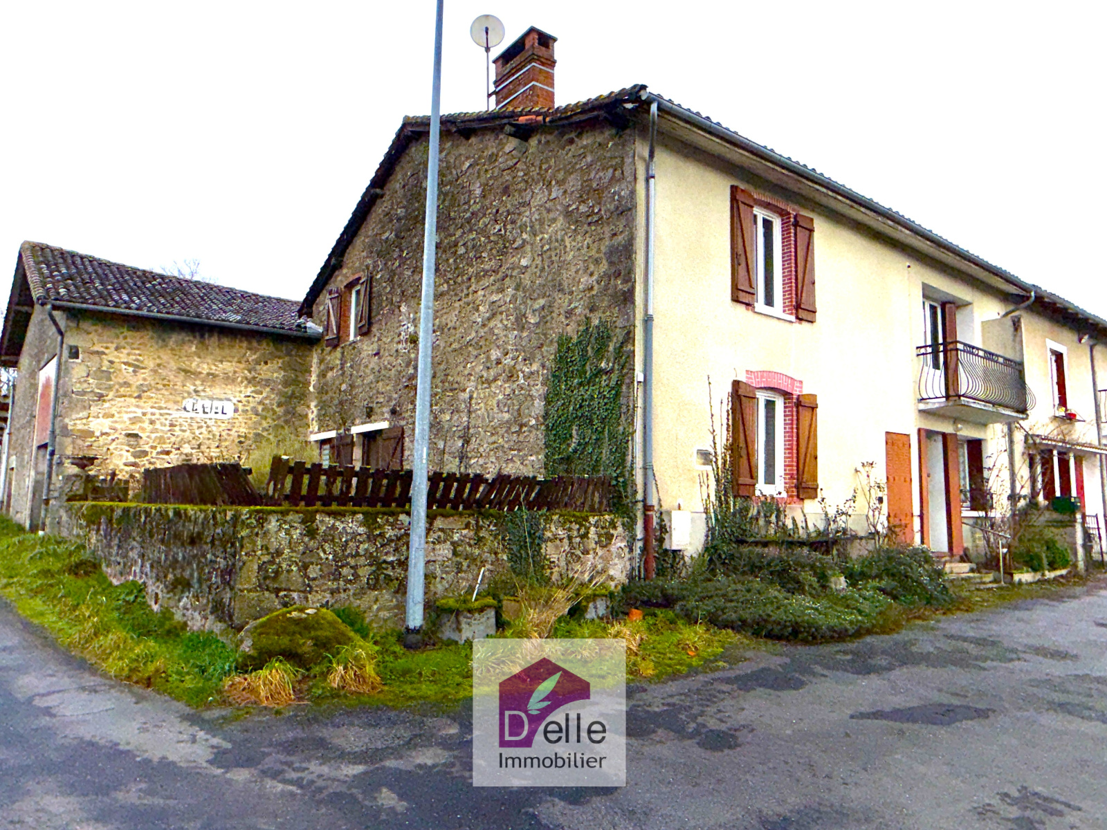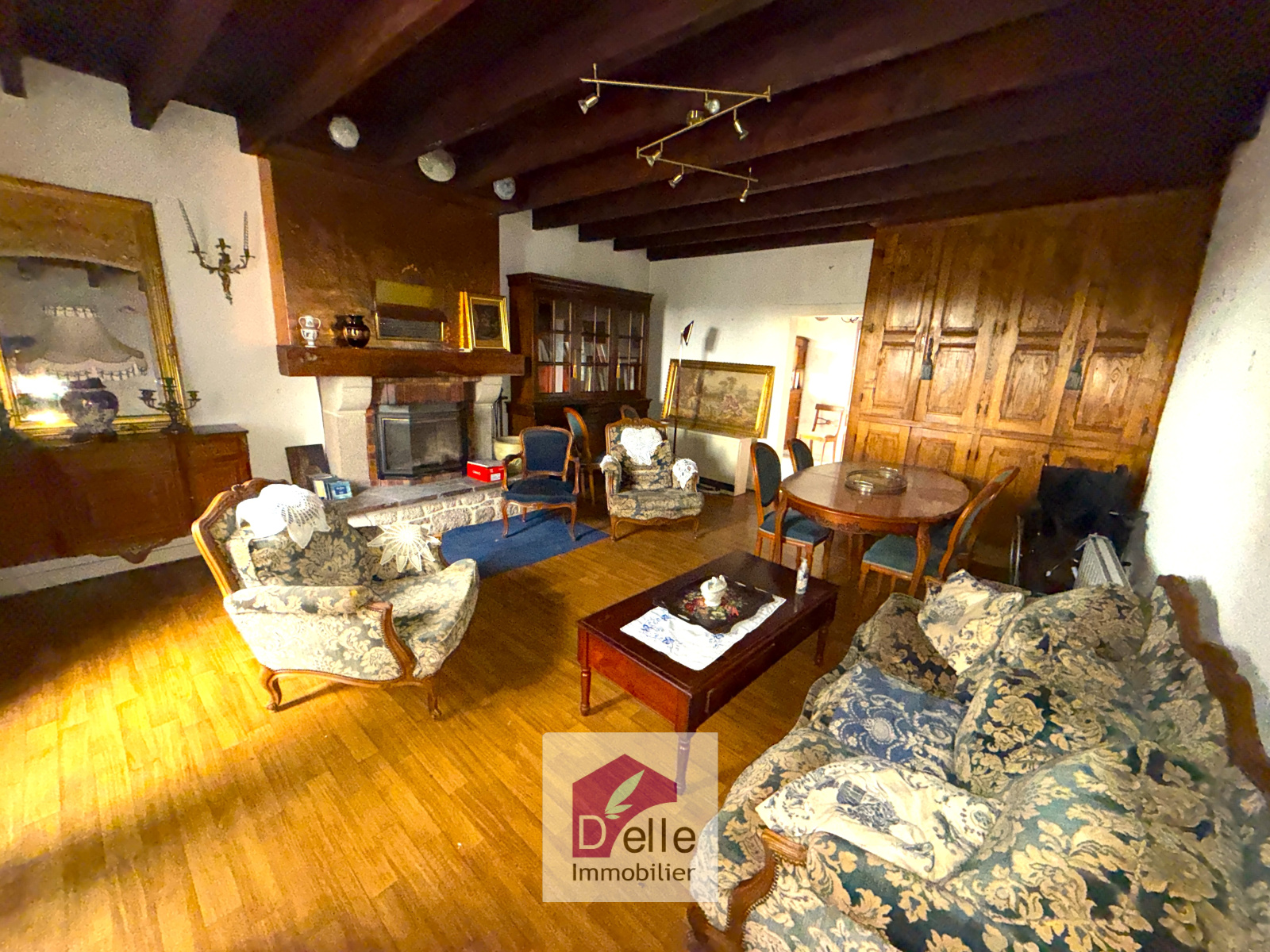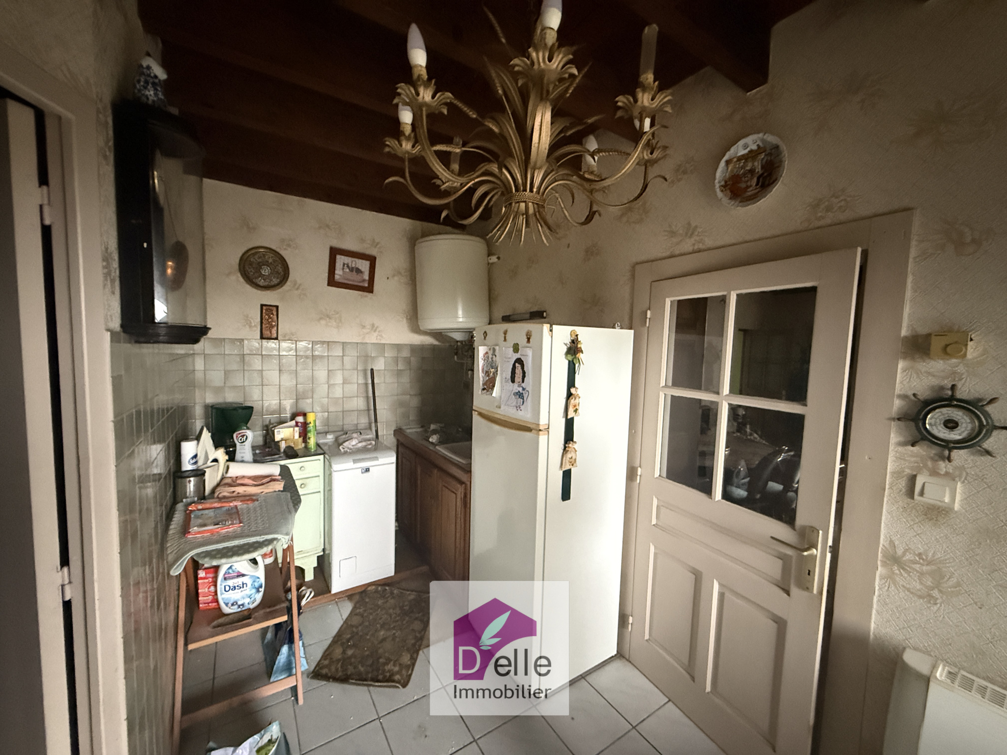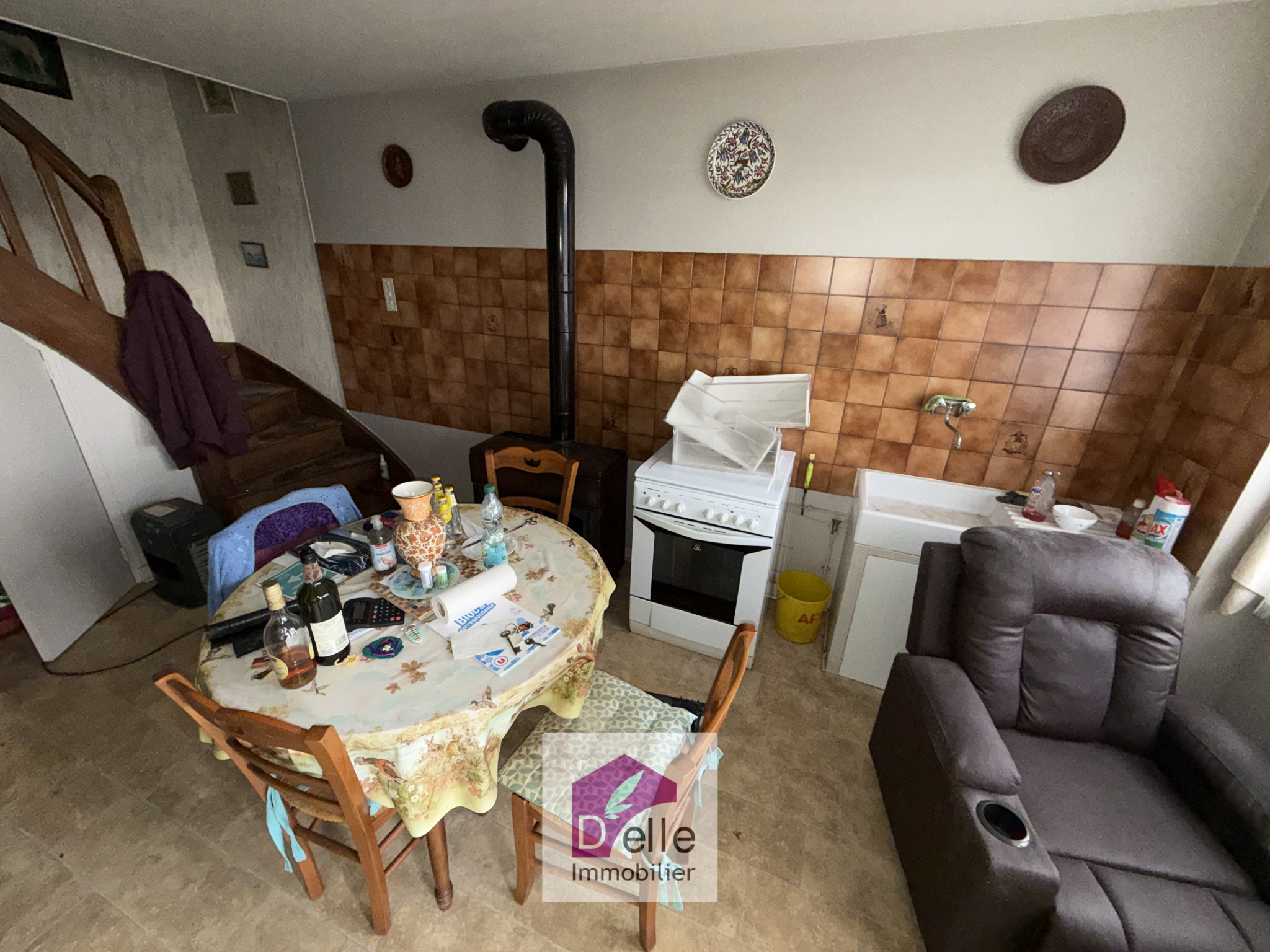 La première maison, rénovée dans les années 80/90 (menuiseries PVC et double vitrage), offre en rez-de-chaussée: un séjour salon avec insert, une cuisine, une salle d'eau avec WC.